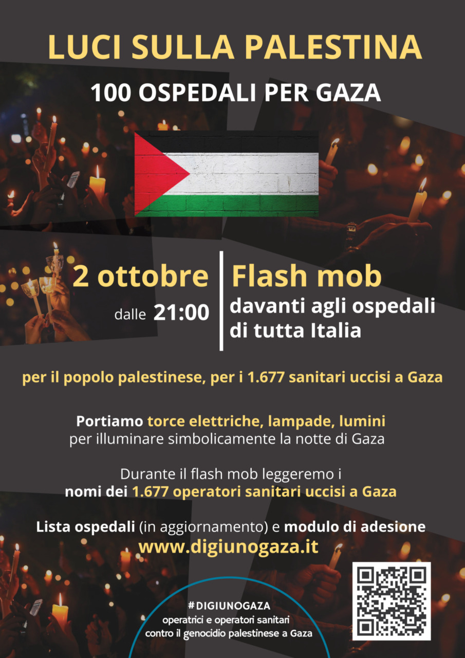 Alle 21 di giovedì 2 ottobre 2025, 100 ospedali italiani si illumineranno insieme per Gaza. L’iniziativa, intitolata “Luci sulla Palestina”, è promossa dalla rete nazionale #DigiunoGaza insieme a Sanitari per Gaza e coinvolgerà strutture sanitarie grandi e piccole, dalle metropoli ai centri periferici.