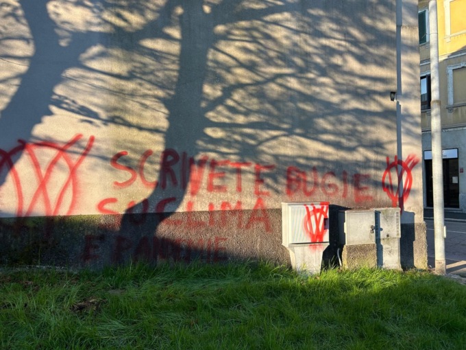 Tutto il tratto di muro dove sono presenti gli ingressi e le finestre della redazione e quello che si affaccia sul parchetto era stato vandalizzato dal simbolo No Vax ripetuto quattro volte per chiarire il concetto e dalla scritta “Voi bugiardisti negate verità come nazisti”.