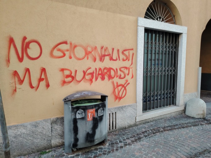 La scoperta al Giornale di Vimercate è stata fatta qualche minuto più tardi. In via Cavour sono comparsi sulla vetrina di ingresso e sui muri il solito simbolo No Vax e una scritta che per lo meno ha la decenza di non richiamare il Terzo Reich: “No giornalisti ma bugiardisti”.