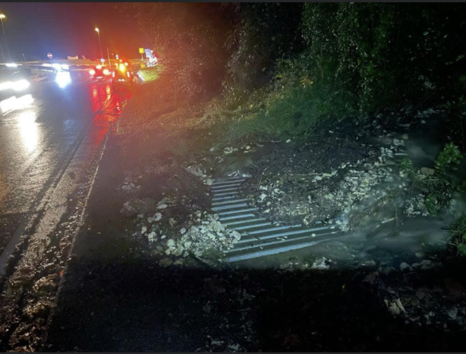 Sulla strada regionale 348 “Feltrina”, rotatoria di Fener, comune di Alano, pulizia tombino raccolta acque, intasato con conseguente riversamento su piano viabile.