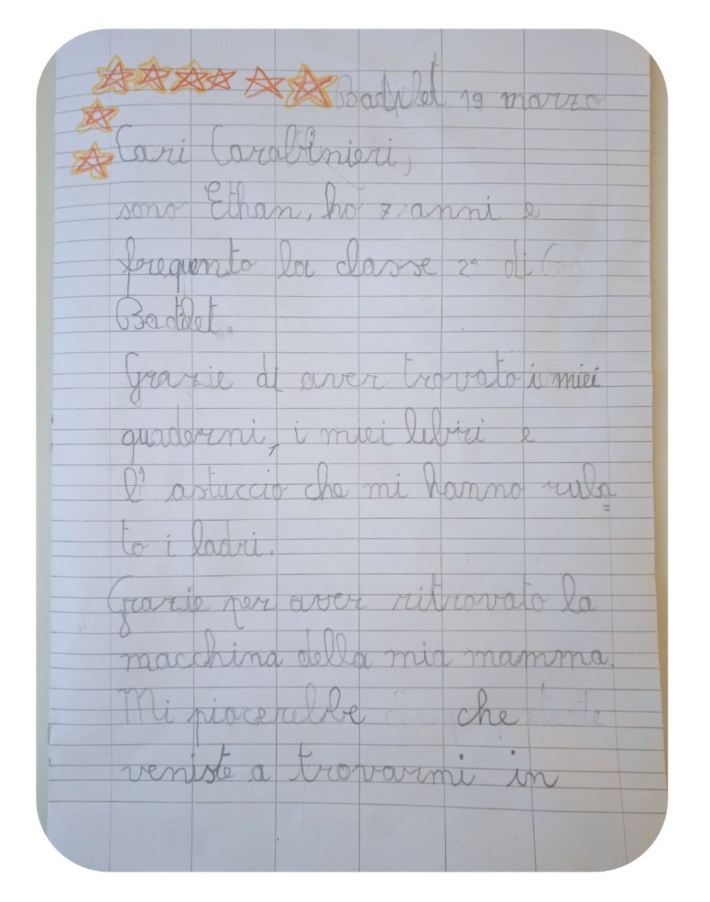 Zaino rubato e poi ritrovato: il grazie speciale di un bimbo ai carabinieri