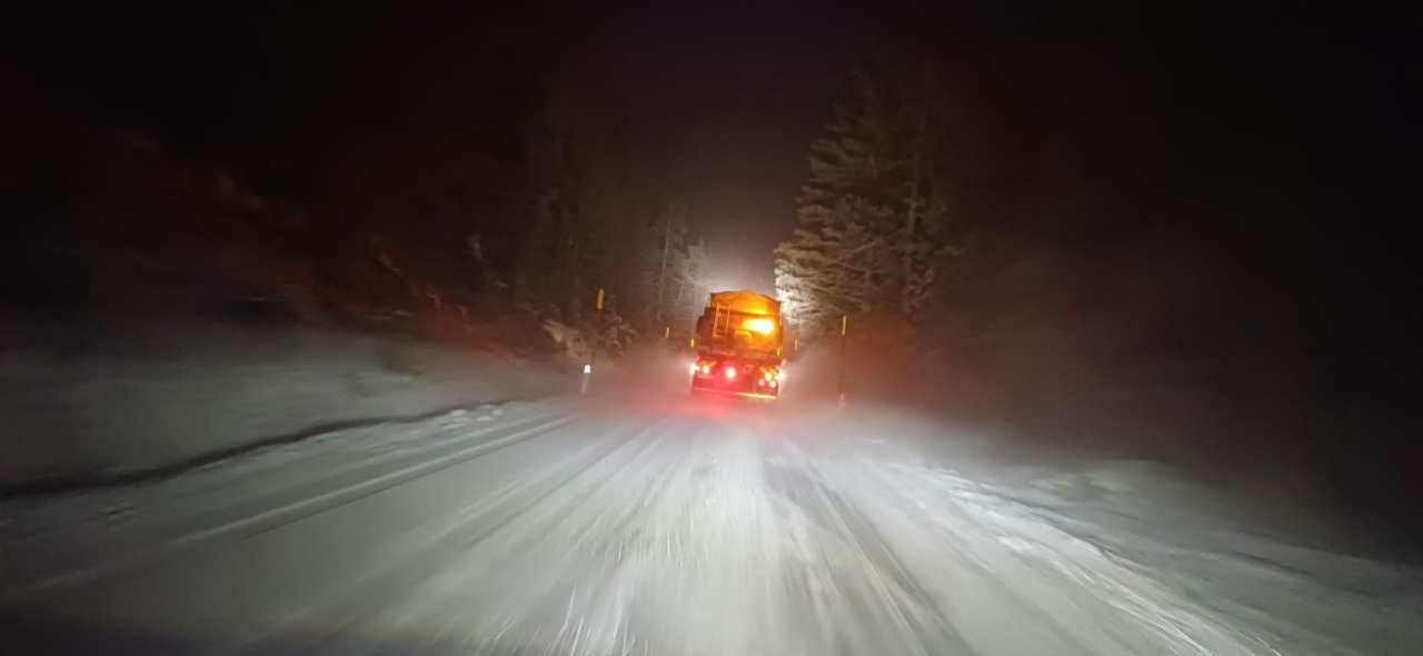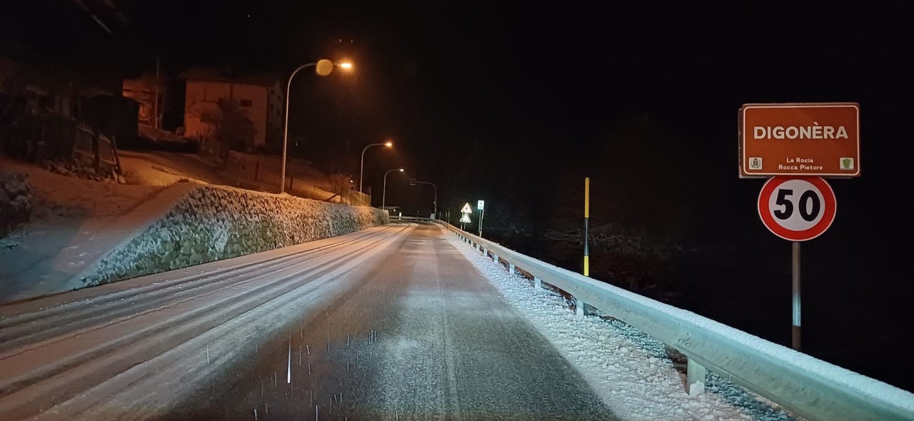 Le precipitazioni hanno imbiancato la sede stradale e le aree circostanti, segnando ufficialmente l’avvio della stagione fredda in quota.
