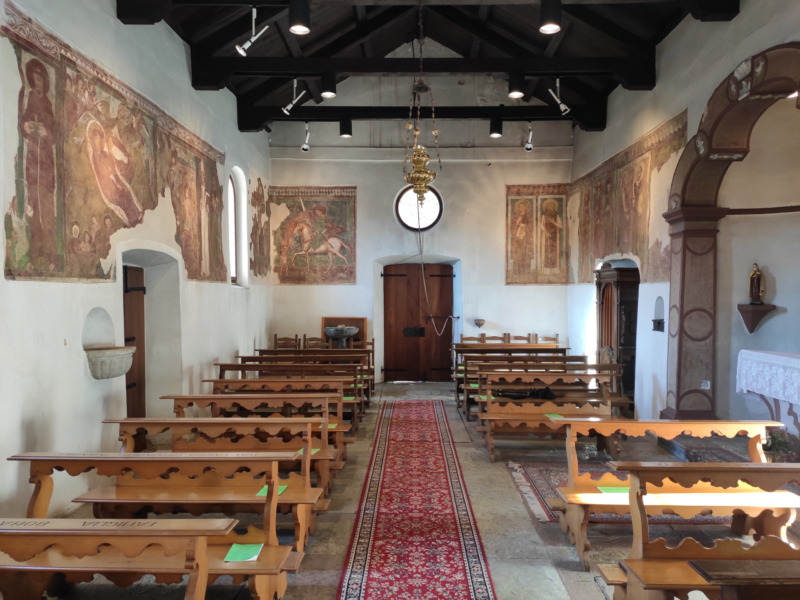 La facciata semplice, con piccolo campanile “a cavaliere”, cela un tesoro inatteso: un ciclo di affreschi trecenteschi, tra le testimonianze più antiche della pittura in Valbelluna. Realizzati da più mani, gli affreschi mostrano influssi bizantini, veneziani, dalmati e l’innovazione giottesca introdotta a Padova. Sulle pareti e sulla controfacciata si susseguono figure di santi e scene evangeliche: San Martino e il povero, la Crocifissione, il Cristo alla colonna, la Flagellazione, la Natività, con l’inedito motivo delle due levatrici (una aureolata, simbolo di fede, e una priva di aureola, simbolo di incredulità). L’impianto volumetrico e lo stile rivelano l’arrivo in area bellunese del nuovo linguaggio giottesco, fino ad allora sconosciuto. QUI per orari.